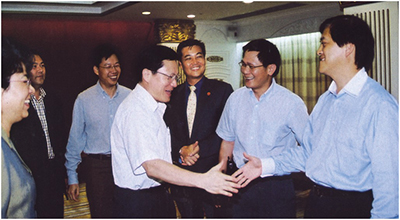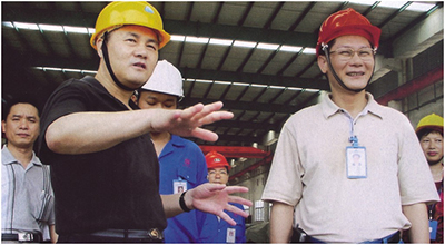 時(shí)任廣州市黃埔區(qū)區(qū)委書記現(xiàn)任廣州市人大常委會(huì)副主任謝寶懷(前左)來(lái)我工廠視察