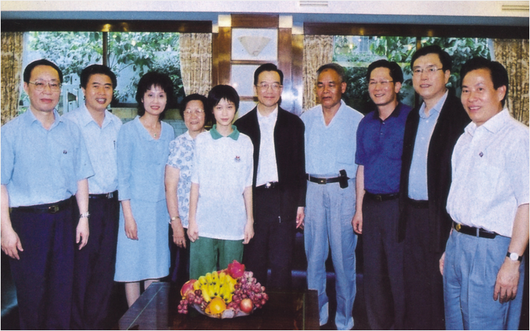 時(shí)任中華人民共和國(guó)國(guó)務(wù)院總理溫家寶(右五)、時(shí)任廣東省省委書記現(xiàn)任中華人民共和國(guó)人大常委會(huì)委員長(zhǎng)張德江(右二)、時(shí)任廣東省省長(zhǎng)黃華華(左二)、時(shí)任廣東省省委副書記蔡?hào)|士(右一)、時(shí)任廣州市市委書記林樹(shù)森(左一)與公司董事長(zhǎng)曾滿洪(右三)及家人在一起。